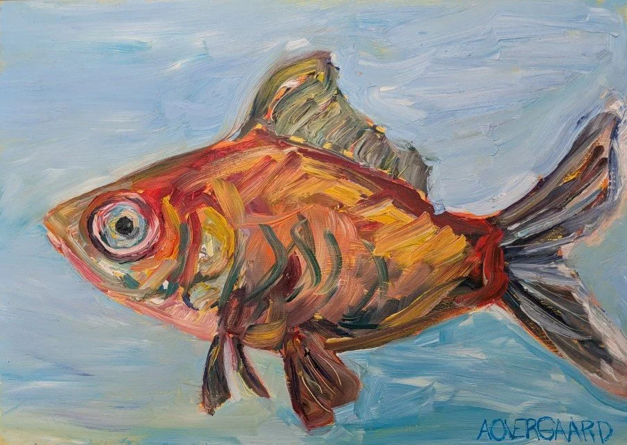 StartledStartled is an oil painting on wood in the alla prima style. This 10 x 14 depicts a colorful fish with bold brushwork. Do I run or swim ?